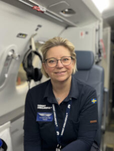 Hösten 2021 kom min chef och berättade att Svenskt Ambulansflyg sökte specialistsjuksköterskor. “Det är väl något för dig”, sa hon. Jag arbetar nu 50% på thoraxiva och 50% på ambulansflyget. Svenskt Ambulansflyg flyger i huvudsak patienter som av olika anledningar behöver flyttas mellan olika regioner, från lägre till högre vårdnivå och vice versa, eller människor som har haft oturen att bli sjuka eller skadade i “fel” region. Våra patienter är bland annat: små bebisar i kuvös, intensivvårdspatienter och patienter som ska transplanteras och behöver komma fram snabbt.